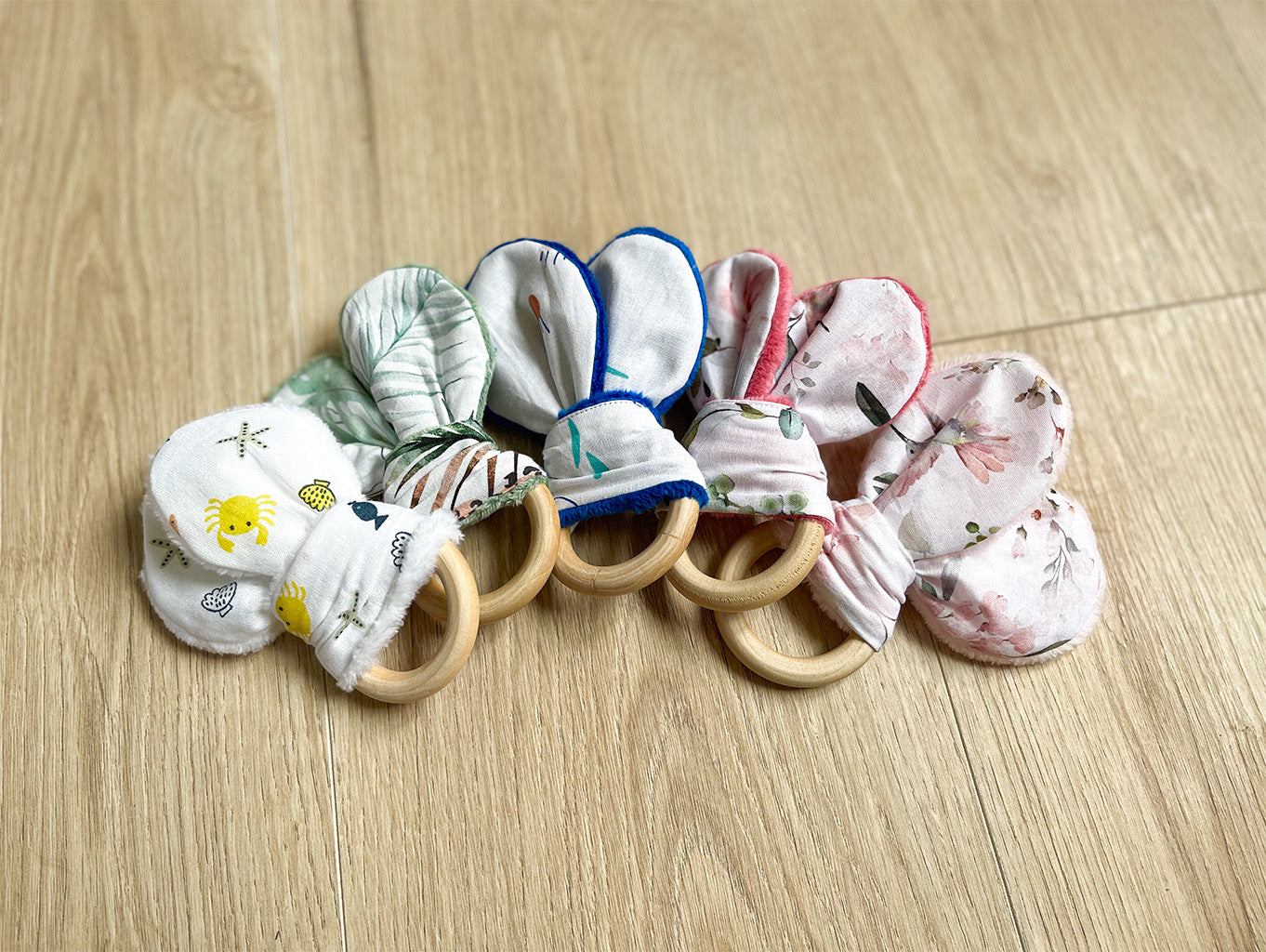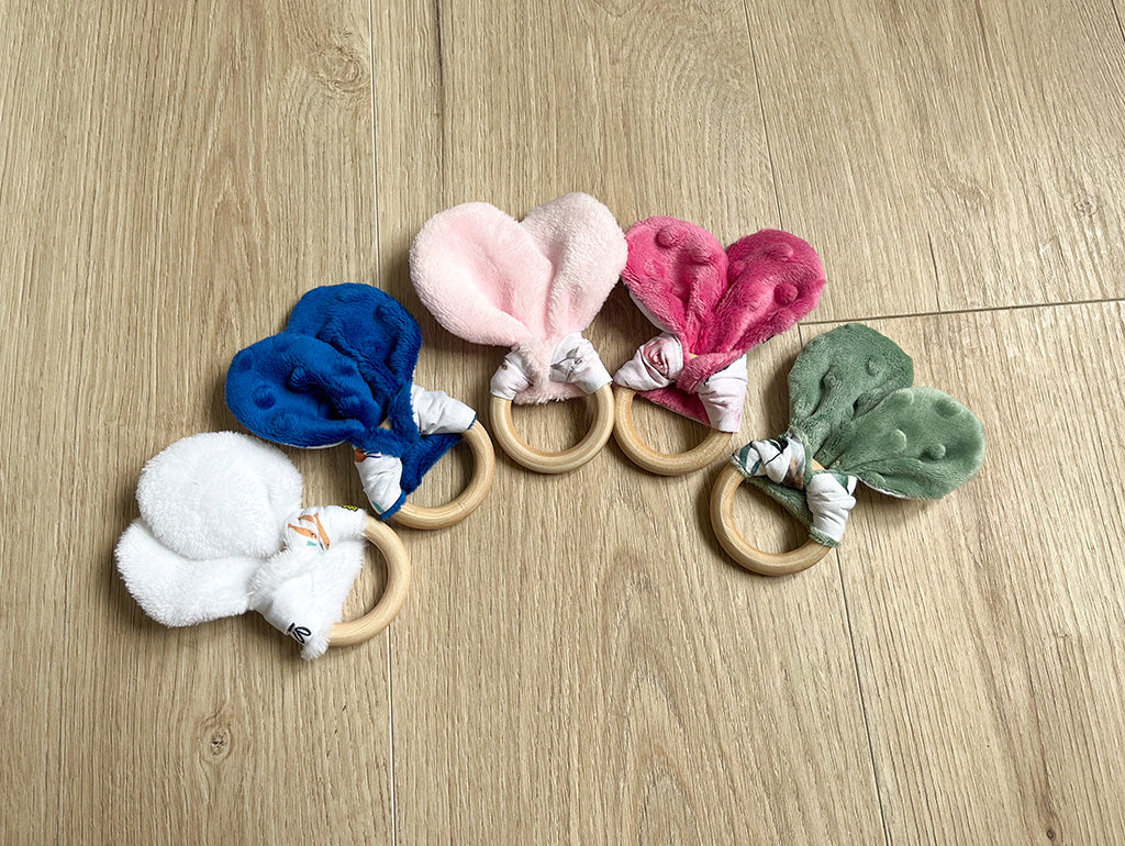Les anneaux sont en bois naturel, non vernis, et minutieusement poncé, parfait pour que bébé puisse faire ses premières dents.